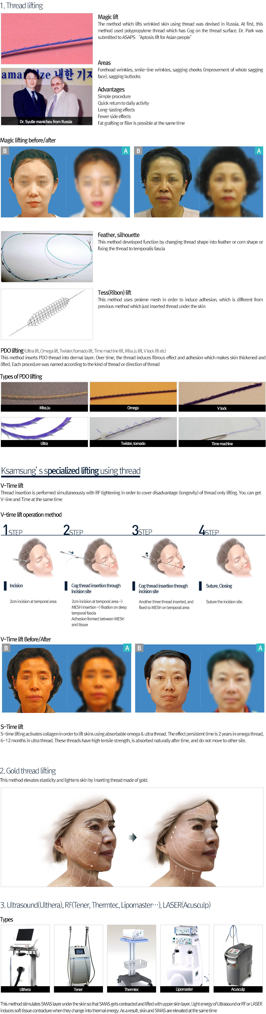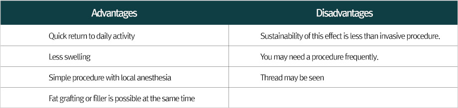 Non-invasive lifting contains thread lifting, operation using ultrasound, and etc. Especially, thread lifting must be performed by specialized surgeon after the sufficient discussion.